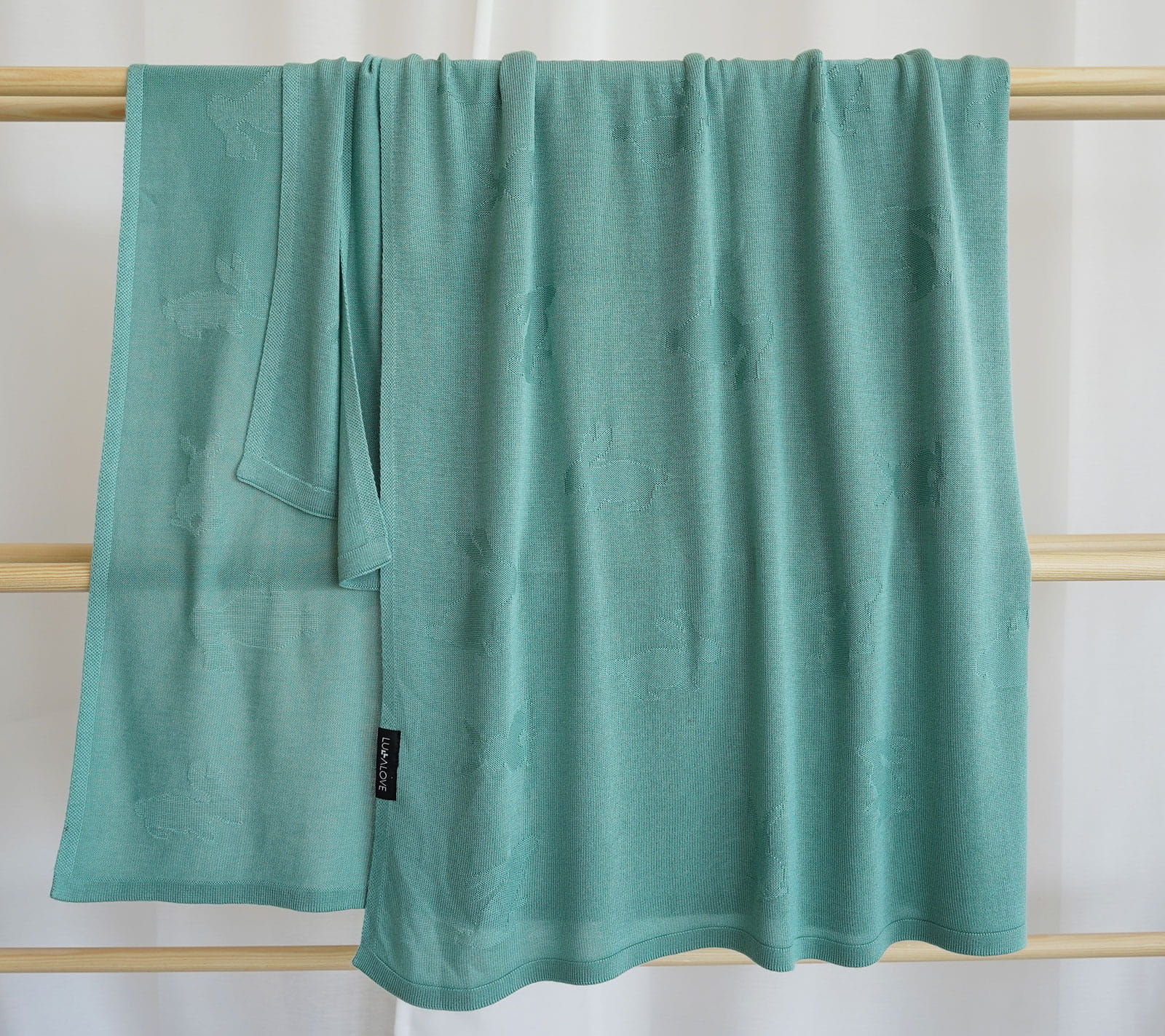 Kocyk wykonany z przędzy bambusowej o lekkim i przewiewnym splocie z króliczkami.