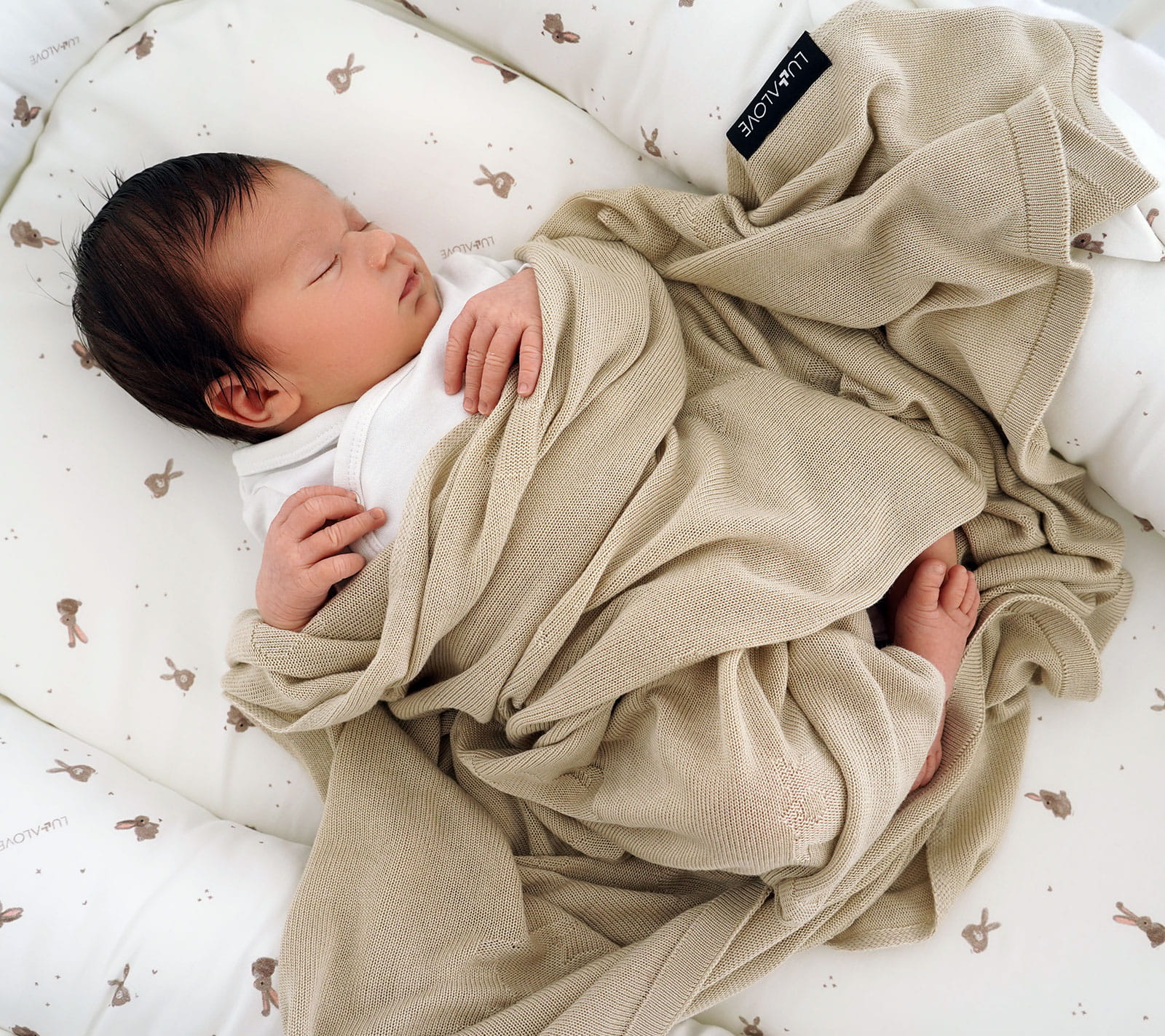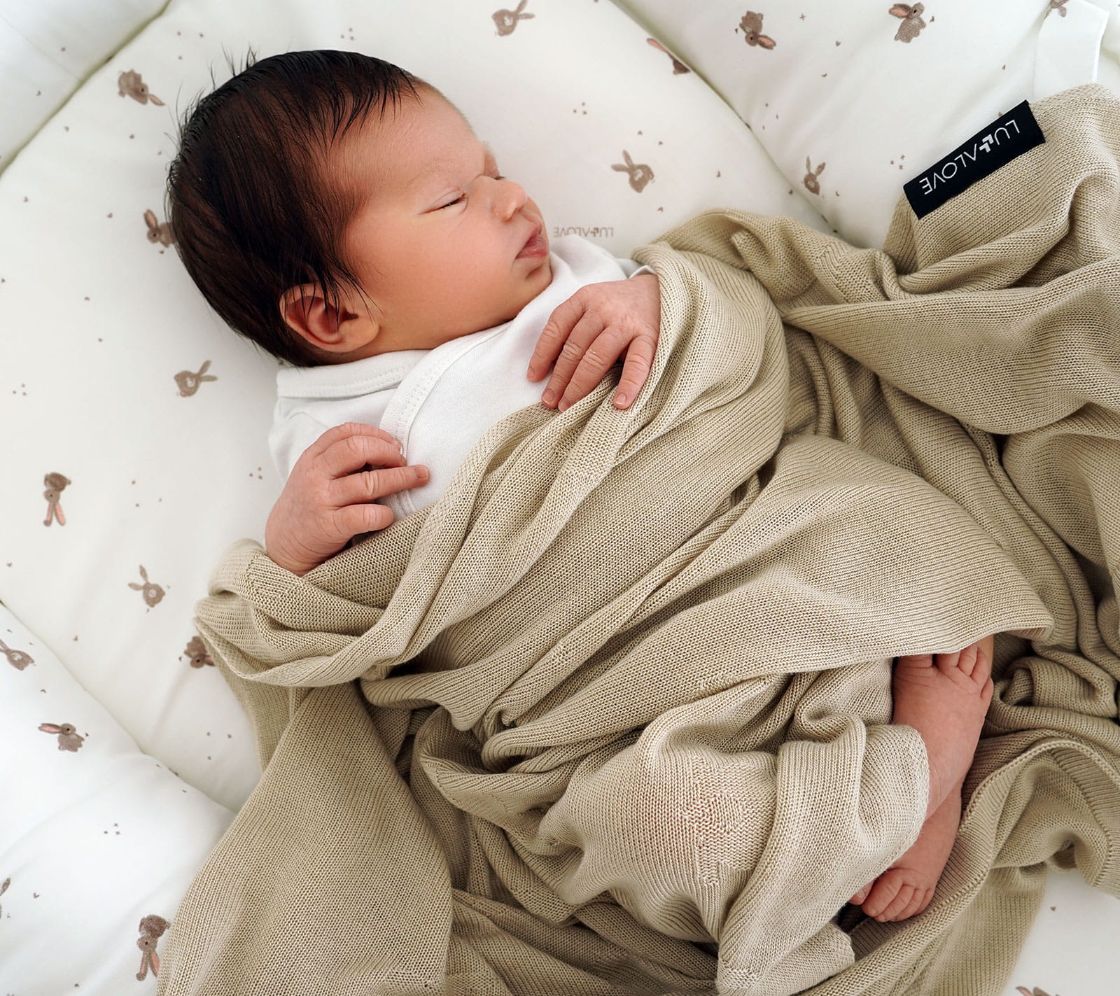 Kocyk wykonany z przędzy bambusowej o lekkim i przewiewnym splocie z króliczkami.