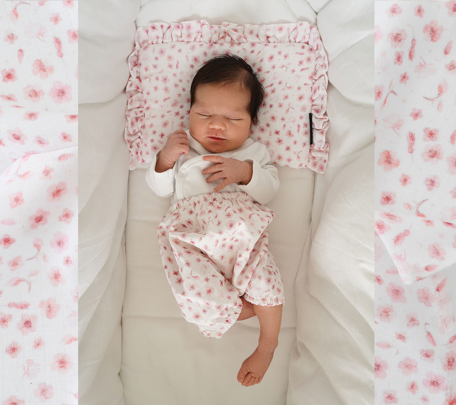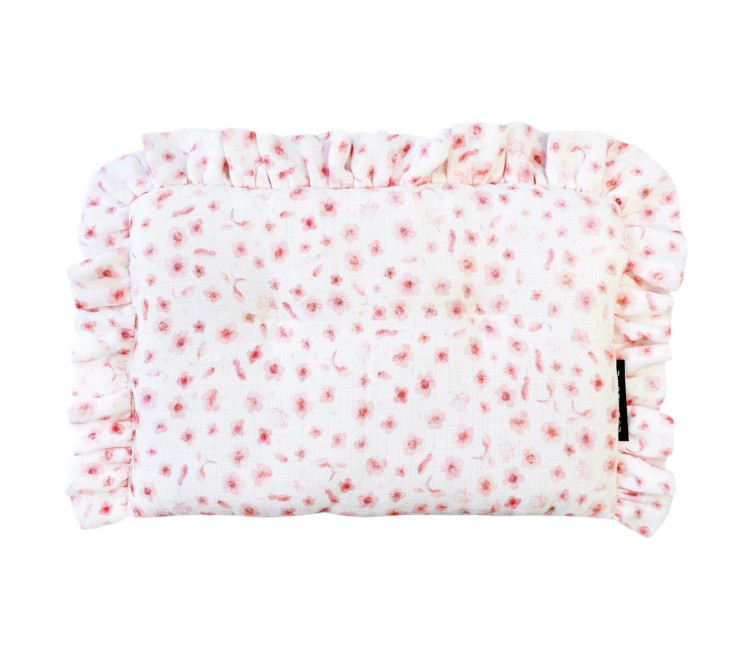 Płaska poduszeczka z falbankami wykonana z muślinu, wzór kwiaty róż.