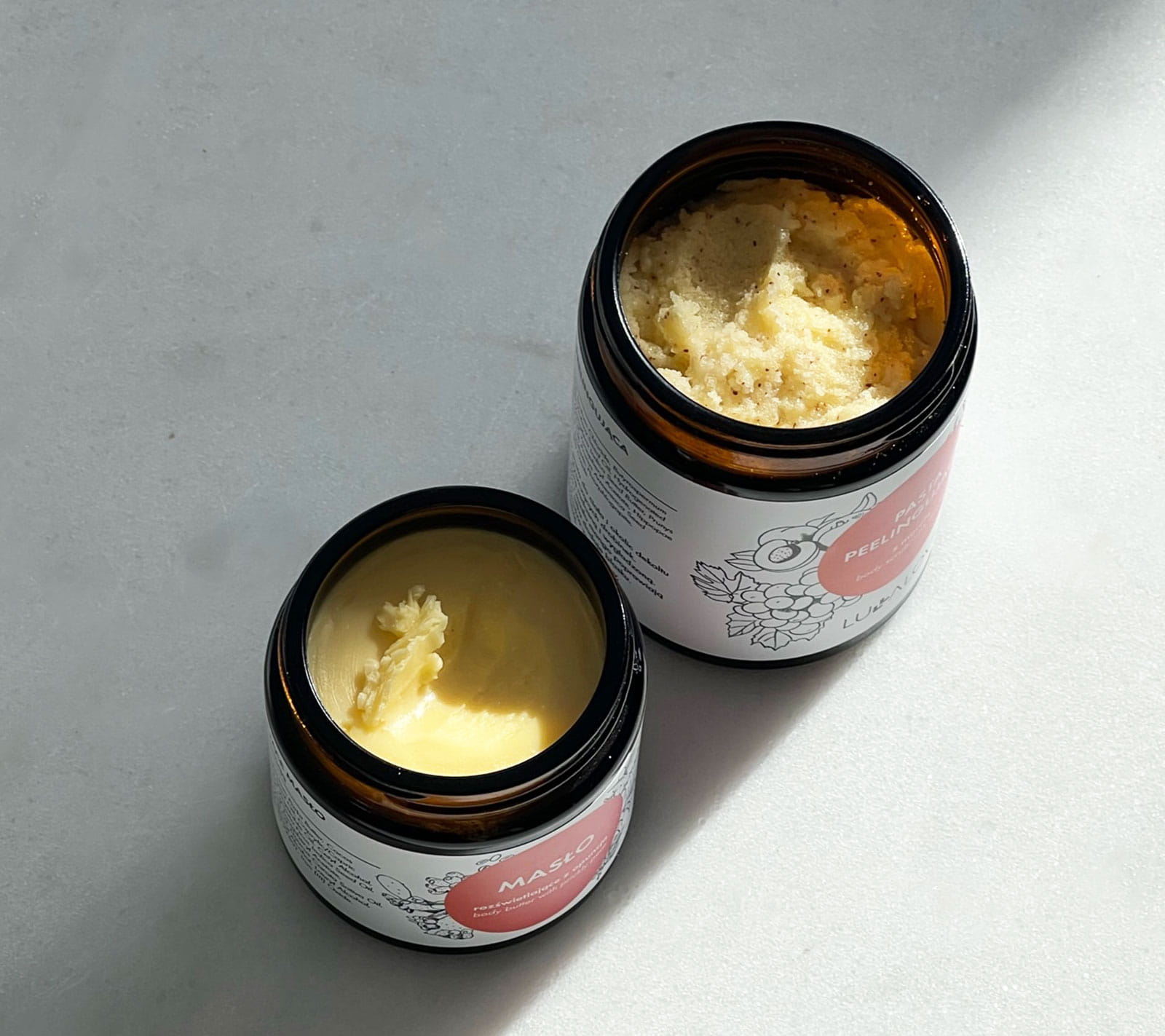 Nasze peelingi wyróżnia skład, który sprawia, że nie tylko złuszczają martwy naskórek, ale są od razu balsamem do ciała. Skóra po użyciu peelingu nie wymaga nałożenia dodatkowego kosmetyku nawilżającego.