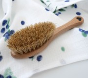 Szczotka dla dzieci i niemowląt z naturalnej szczeciny z drewnianą rączką w zestawie z praktyczną muślinową myjką.