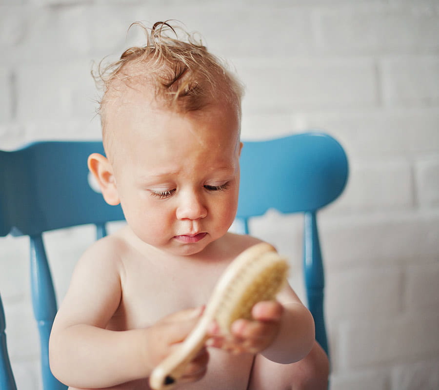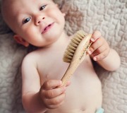 Małych rozmiarów szczotka z naturalnym włosiem o idealnym stopniu twardości dostosowanym do skóry dzieci. Doskonale wyczesuje i masuje skórę głowy pomagając przy ciemieniusze. Pomocna przy rozczesywaniu kołtunów. W komplecie z delikatną, muślinową myjką, która sprawdzi się w codziennej pielęgnacji Maluszka. Myjka może być używana jako pieluszka do osuszania skóry.